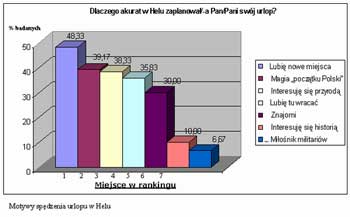 Pierwszy blok pytań ankietowych dotyczył motywów wyboru Helu na miejsce letniego wypoczynku. Blisko połową pytanych powodowała ciekawość i chęć poznania nowego miejsca. Wielu ankietowanych wskazywało także na wynikającą z położenia geograficznego "magię początku Polski".